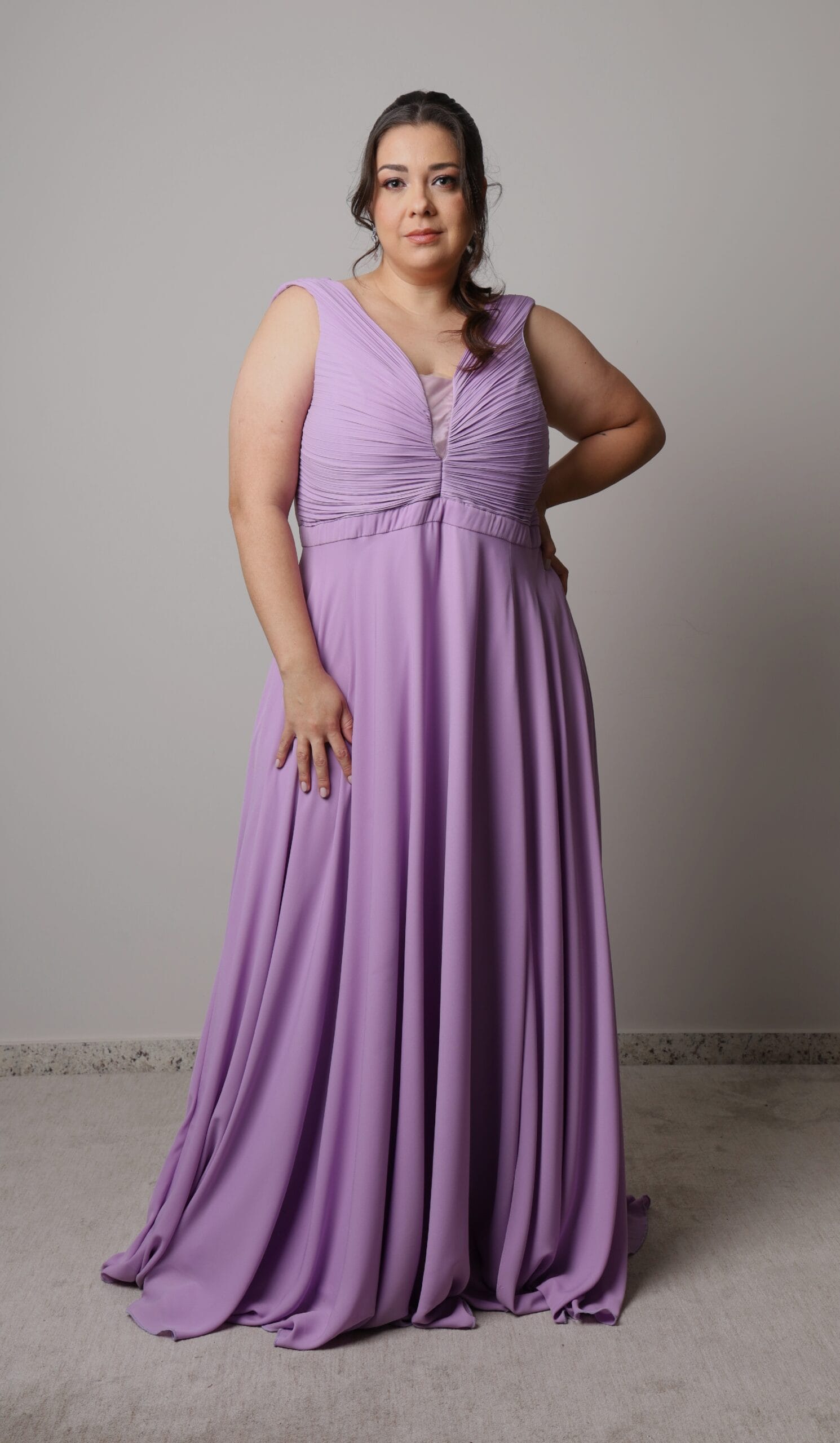 A musseline lilás desenha um visual leve e acolhedor, com busto plissado que valoriza o colo de forma delicada e elegante. A cintura suavemente marcada dá início à saia godê, que cai solta, fluida e com movimento natural a cada passo. Um vestido que equilibra conforto, feminilidade e presença